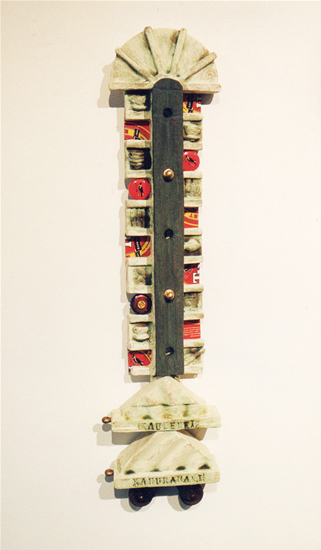 clay, metal, wood, found materials; 2000mm x 750mm x 100mm;Archivista - Hawke’s Bay Exhibition Centre; 1999